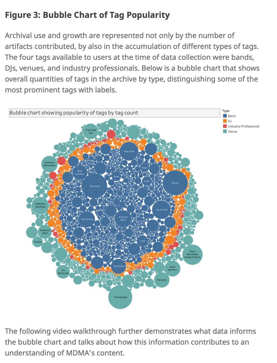 The Power of the Popular examines the practices of Manchester Digital Music Archive (MDMA), a volunteer-run and user-generated community archive that aims to celebrate and preserve music from Greater Manchester, the large metropolitan area including and surrounding the city of Manchester, England. Data and network visualizations of crowdsourced contributions done in collaboration with the MDMA helped Kate explore different kinds of community contributions to popular music preservation in Manchester.